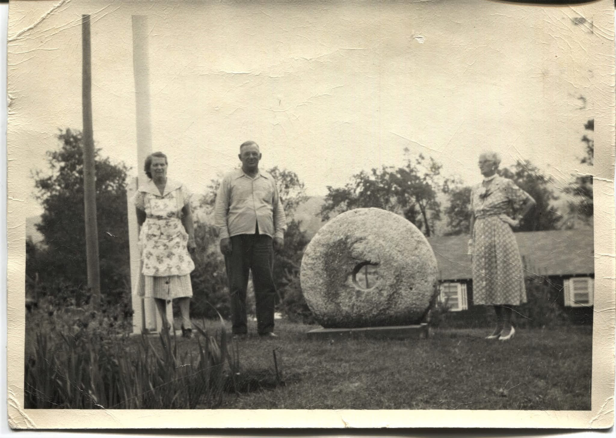1955 - Clovis LeVeille (Little Amsterdam Road) with the grist mill wheel from Burnham's Mill.