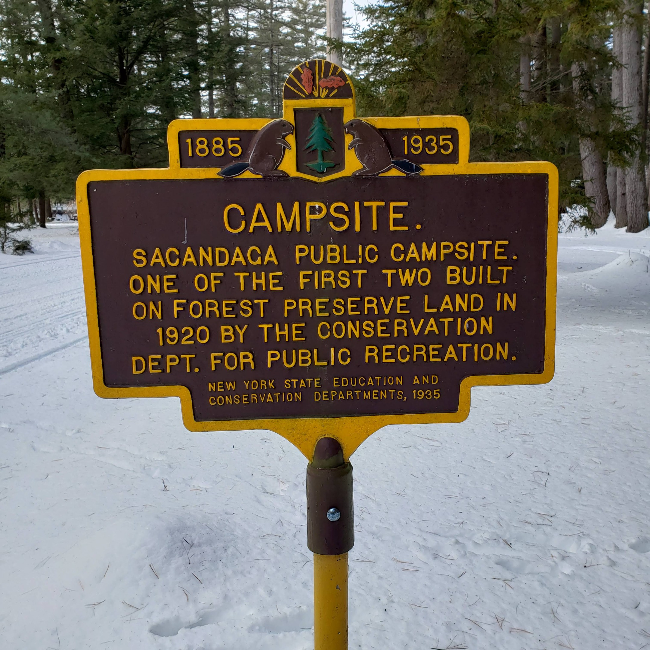 An original marker paying tribute to the 150th Anniversary of the American Revolution established in 1935 South of Wells recognizes the Sacandaga Campsite (displayed above); and the newest, a Pomeroy Marker, was unveiled in 2023 to commemorate the former mills where local artist John Van Alstine's studio is currently located at the South side of town (displayed below).