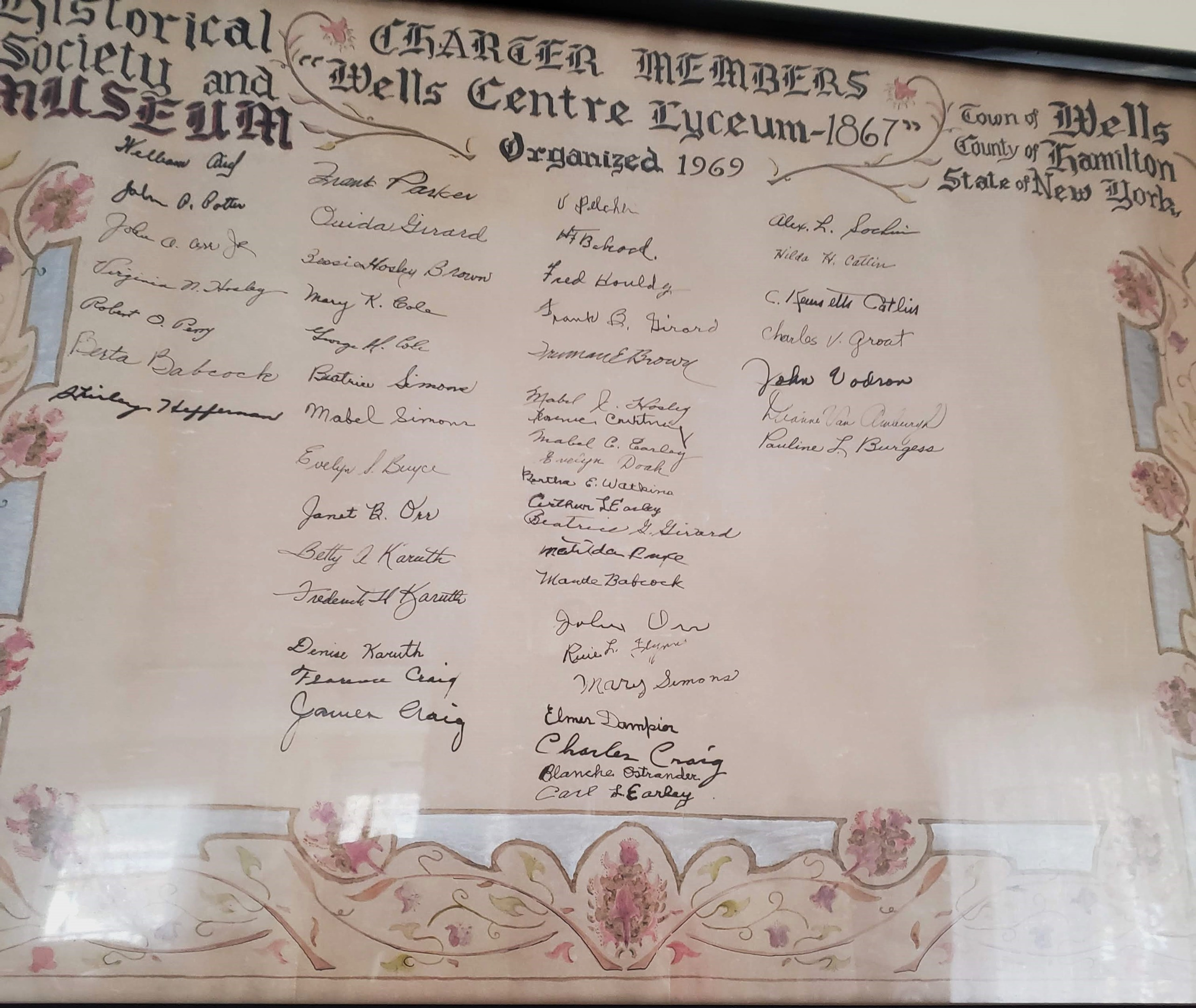 Wells' first Historical Society, initially the 1867 Wells Centre Lyceum, held their first meeting in 1968 at the Community Hall. Charter memberships were awarded to nine 75-year-old and older residents: Vern Pelcher, who was the eldest present at 94; Hiram Babcock; Fred Houldy; Frank Girard; Truman Brown; Mabel Hosley; Mabel Earley; Bertha Watkins; and Beatrice Girard.