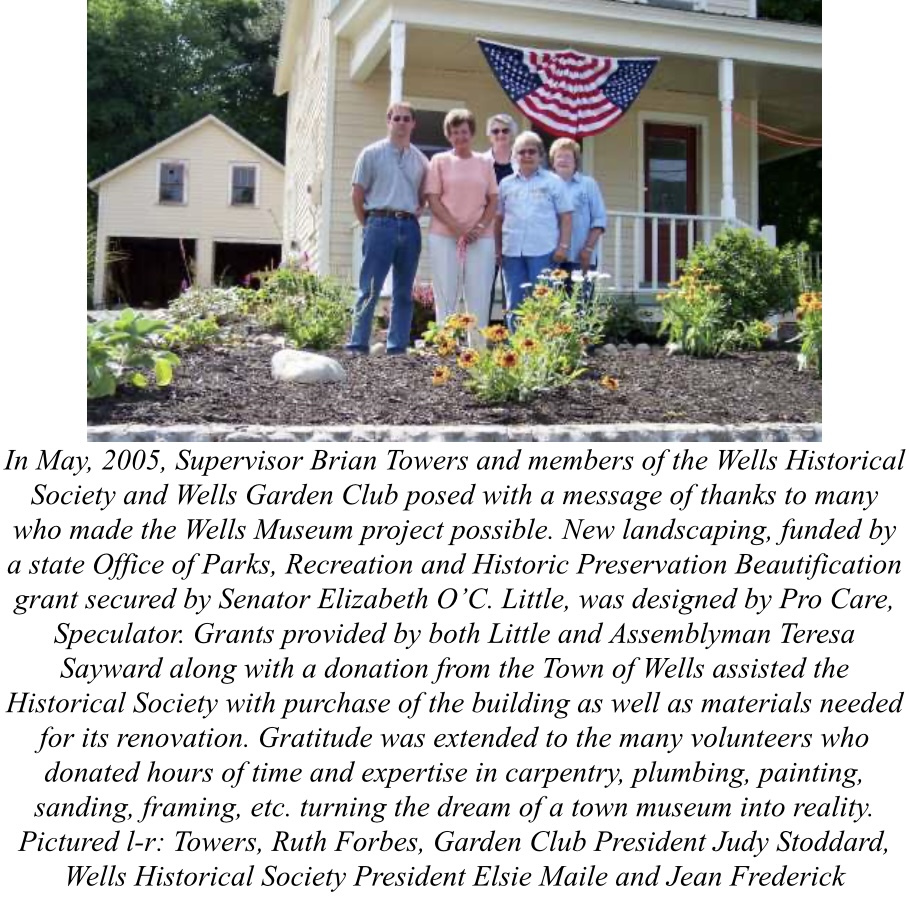 The current Wells Historical Society Museum became a reality in 2005. Grants provided by Assemblywoman Teresa Sayward, along with a donation from the Town of Wells, assisted the Historical Society with the purchase of the building as well as materials needed for its renovation. Many volunteers donated hours of time and expertise in carpentry, plumbing, painting, sanding, and framing, turning the dream of a town museum into reality. New landscaping, funded by a state Office of Parks and Recreation and Historic Preservation and Beautification Grant secured by Senator Elizabeth O'Connor Little, was designed by Pro Care of Speculator. Gratitude is extended to former Wells Historical Society President Elsie Maile and Jean Frederick to turning the dream of a town museum into reality.